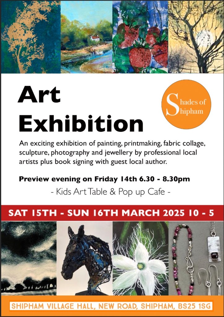 ‘Shades of Shipham’ artists are back for their annual exhibition in Shipham village hall. This year’s show takes place on Saturday 15th and Sunday 15th March 10am – 5pm with a preview evening on Friday 14th 6.30 – 8.30pm. Entry is free and as usual we’ll be serving drinks and delicious cakes from our pop-up café for cash donations.